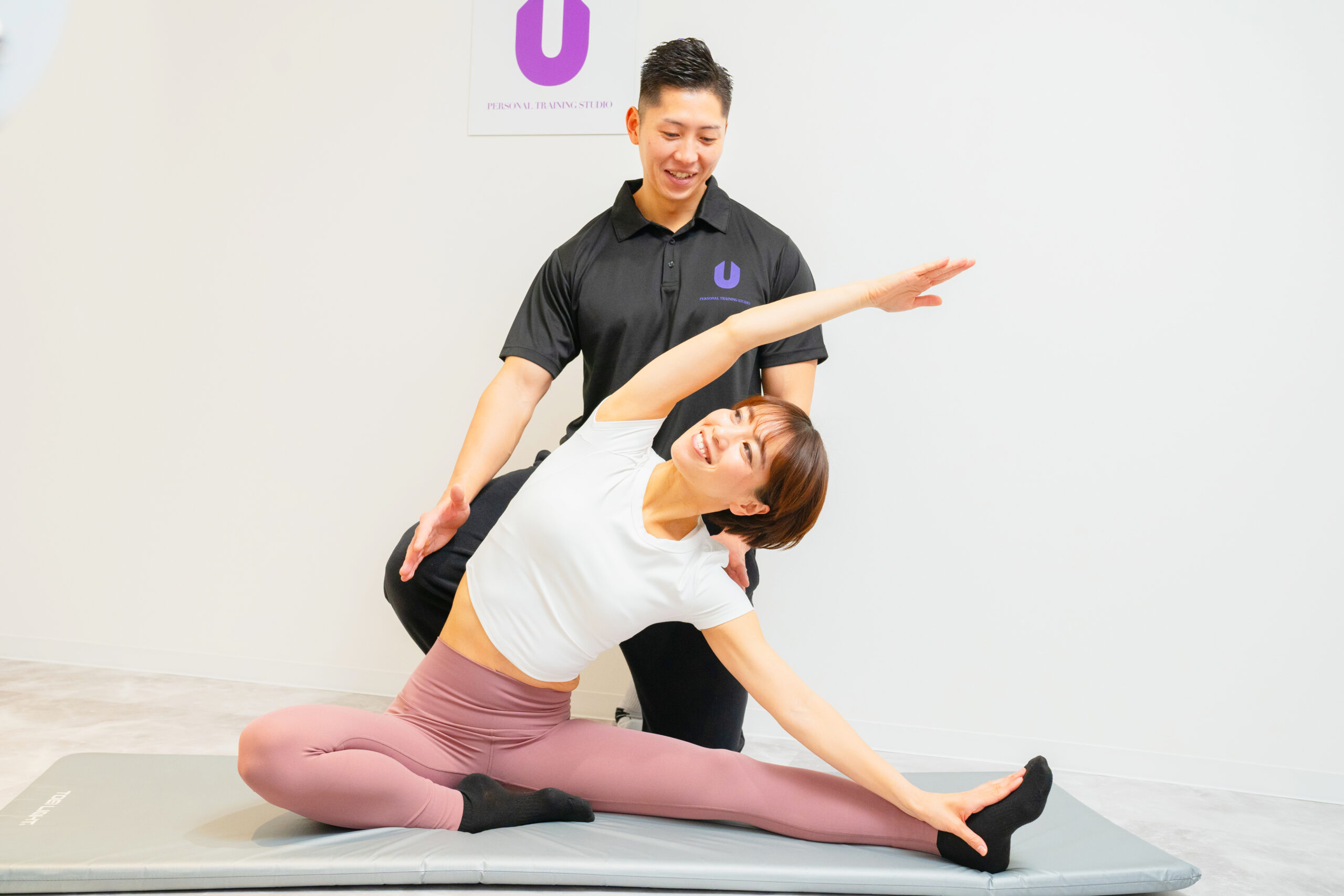 他のパーソナルジムでは、トレーニング指導のみに特化しているという店舗も少なくありません。 しかし、PERSONAL TRAINING STUDIO Uではトレーニング指導だけに留まらず今体に生じている痛みなどの不調に対してもアプローチができます。 コンディショニングとストレッチの二本柱で肩こりや腰痛、膝の痛みなどの改善を目指しながら筋肉をつけられるのです。